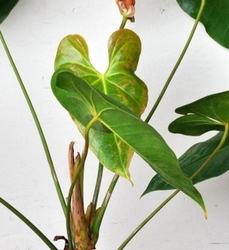 Трипсы. Участки листьев антуриума приобретают неравномерную желтовато-белую окраску. Темные выделения, особенно на нижней стороне листьев, указывают на присутствие трипсов. Эти мелкие, продолговатые желтоватые или бурые насекомые обычно сидят на нижней стороне листьев. Их появлению способствуют высокая температура и влажный воздух. При сильном поражении листья сохнут и опадают.